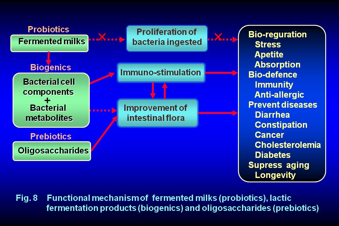 The most important function of lactic fermentation products is immuno-stimulation. That is, probiotics, biogenics and prebiotics improve the balance of the intestinal flora by enhancing the growth of bifidobacteria and/or inhibiting the growth of harmful bacteria, resulting in immuno-stimulation. Biogenics, above all, are far favored for health effect, because the number of bacteria 1000 times or more than that of probiotics as shown in Table 1.