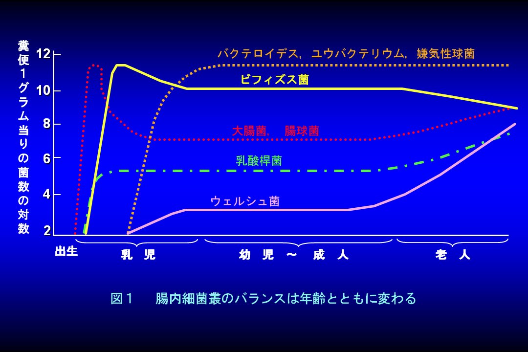 乳児が離乳食を摂るようになると、腸内細菌のバランスは成人のパターンに似てきます。幼児から成人の腸内細菌のバランスはバクテロイデス、ユウバクテリウム、嫌気性連鎖球菌などの嫌気性菌が最も優勢となり、ビフィズス菌は腸内細菌全体の10~20%程度に減少します。一方、大腸菌や腸球菌は総菌数の100分の1以下にすぎません。このように、幼児以後の腸内環境は乳児に比べるとはるかに悪いのです。